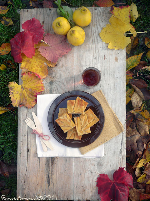 Quadrotti integrali di torta con mele cotogne e calvados